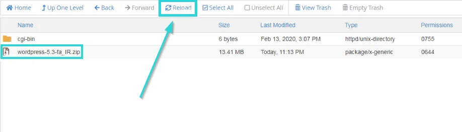بعد از آپلود شدن کامل فایل، باید به پوشهی “Public_html” برگردید. همانطور که مشاهده میکنید فایل وردپرس در این قسمت قرار گرفته است. البته گاهی ممکن است فایل وردپرس نمایش داده نشود که باید از گزینهی “Reload” استفاده کنید تا فایل نمایش داده شود.