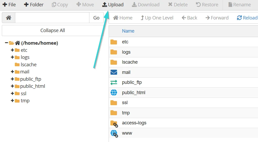 پس از ورود به “Public_html” باید فایل فشرده وردپرس را که در مرحله ۱ دانلود کردید در این پوشه آپلود کنید. برای این کار باید از گزینهی “Upload” استفاده کنید.