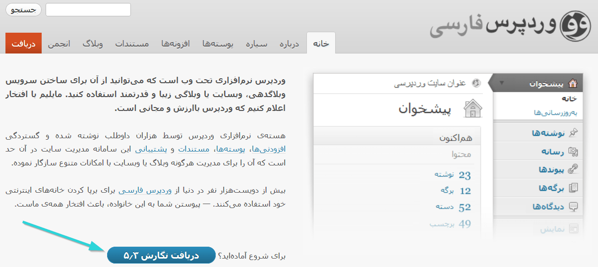 ابتدا باید وردپرس را دانلود کنید. میتوانید جدیدترین نسخهی آن را از سایت وردپرس فارسی دانلود کنید. برای اینکار فقط کافی است وارد سایت وردپرس فارسی شده و مطابق شکل بر روی قسمتی که اشاره شده کلیک کنید تا آخرین نسخه از وردپرس دانلود شود.