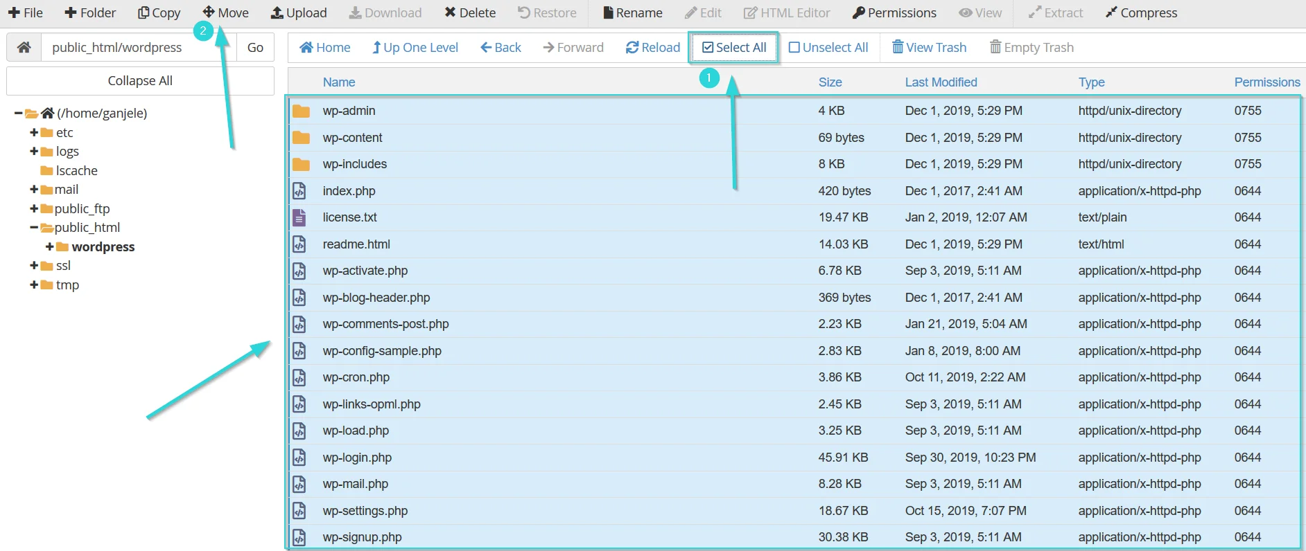 در این مرحله باید تمام محتویات داخل پوشه “wordpress” را به پوشهی “Public_html” منتقل کنید زیرا همانطور که گفته شد وردپرس باید روی پوشهی “Public_html” نصب شود. اگر وردپرس روی این پوشه نصب نشود، با وارد کردن آدرس دامنه در مرورگر سایت خود را مشاهده نخواهید کرد. برای اینکار وارد پوشهی “wordpress” شوید. سپس روی گزینهی “Select all” کلیک کنید تا تمام فایلها انتخاب شوند. بعد از انتخاب همهی فایلها روی “Move” کلیک کنید.