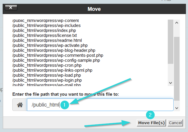 بعد ازینکه روی “move” کلیک کردید، پنجرهای مطابق شکل زیر برای شما نمایان خواهد شد. در این پنجره تمام فایلهای انتخاب شده را مشاهده میکنید. برای انتقال فایل ها در نواری که بالای آن عبارت “:Enter the file path that you want to move this file to” نوشته شده کلمهی “wordpress “را پاک کنید تا مسیری که قرار است فایلها به آنجا منتقل شوند (یعنی پوشه “Public_html” انتخاب شود.) سپس روی “Move File” کلیک کنید تا تمام فایلها منتقل شوند.