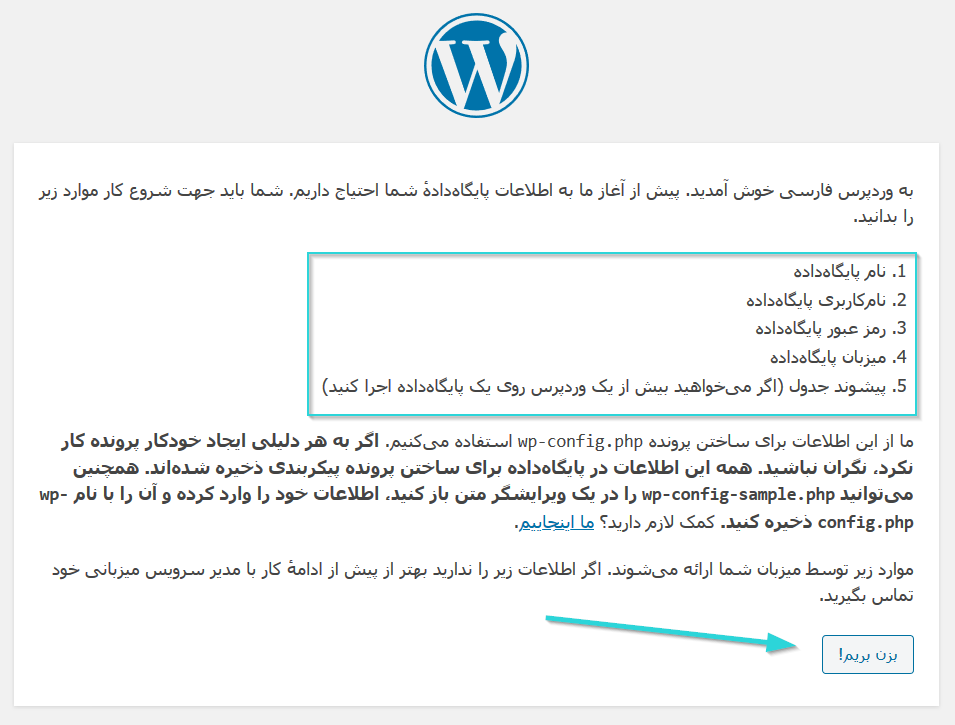 حال آدرس سایت خود را در مرورگر وارد کنید. هنگامی که وارد سایت شوید با تصویری مطابق تصویر زیر روبرو خواهید شد. در این صفحه مواردی را که برای نصب وردپرس احتیاج دارید نوشته است که ما در مراحل قبلی نحوهی ساخت آنها را آموزش دادیم. روی گزینهی “بزن بریم” کلیک کنید.